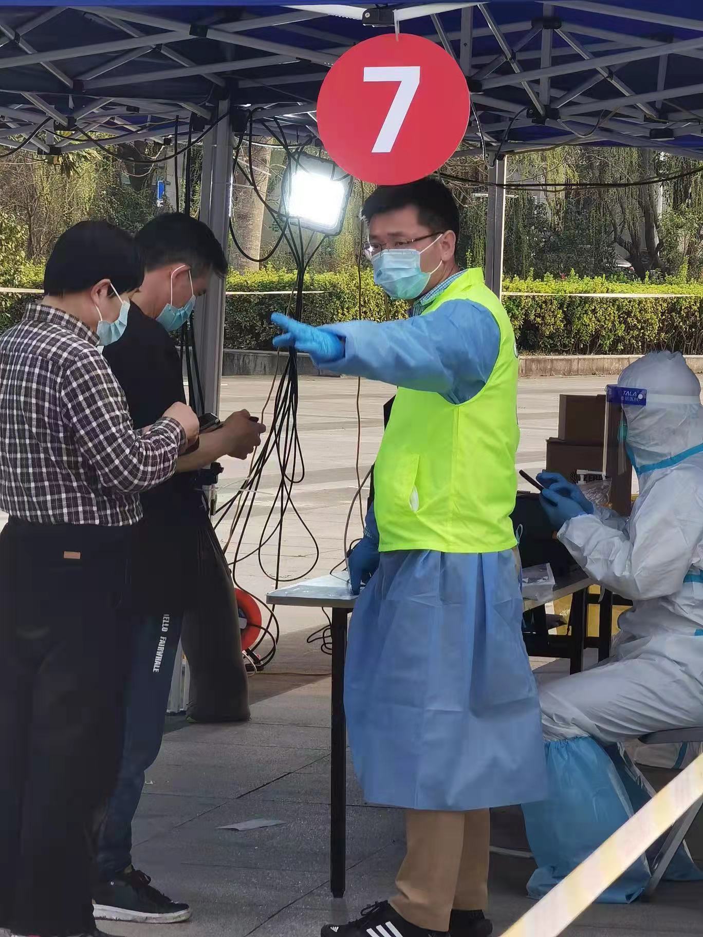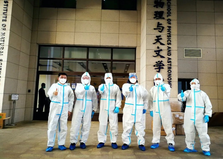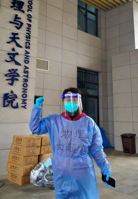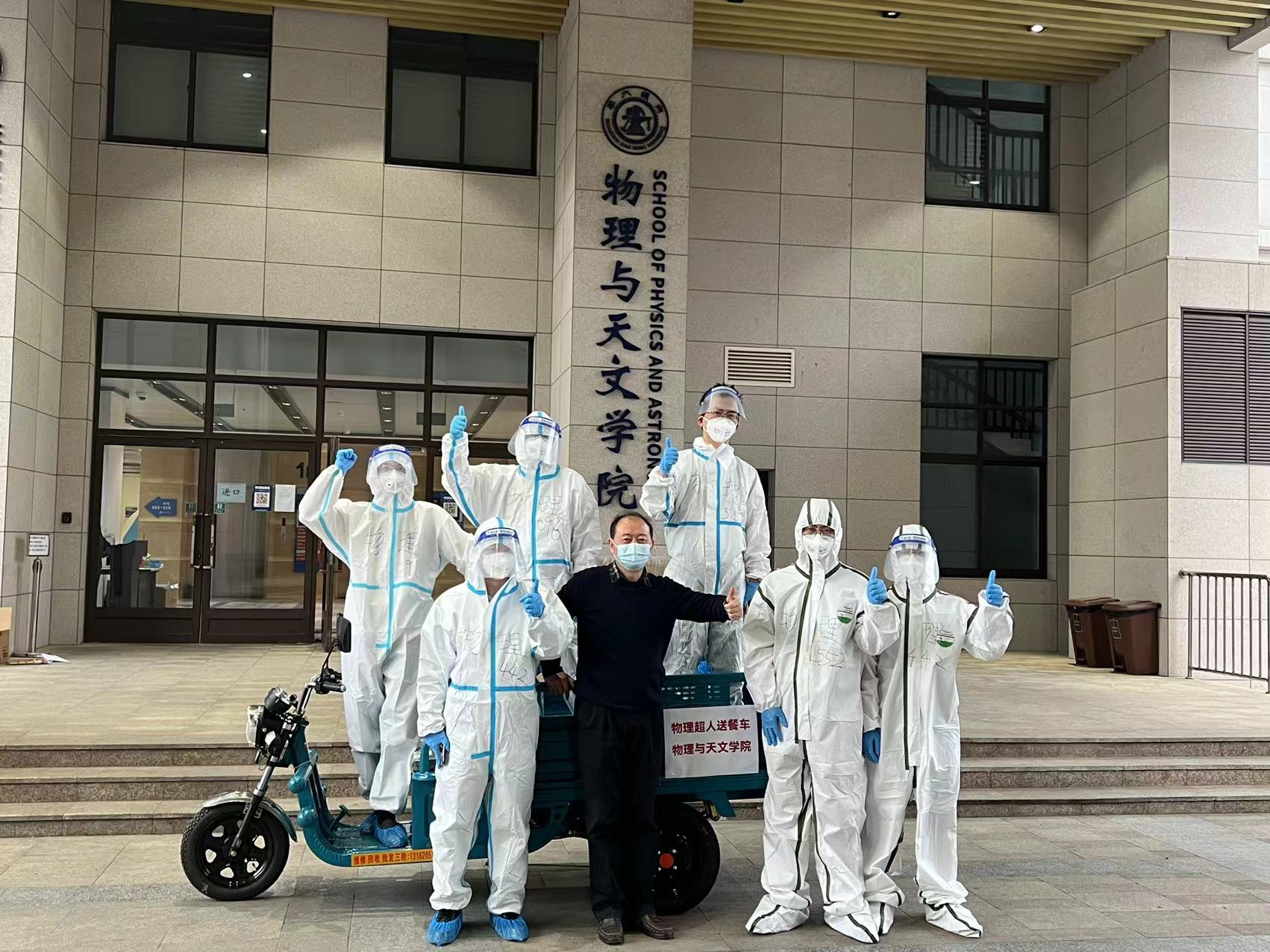 朱敏统筹调度,负责安排好公司在校师生的衣食住行,配合公司落实安全保障工作。校研究生院培养办主任、公司党委委员、凝聚态物理党支部书记刘灿华第一时间响应公司号召,逆流返校,不仅是参与核酸检测区志愿服务的首批教师,还在送餐忙碌的时段,回公司支援配送。缪毅强老师是年近60岁的老党员,他身体抱恙还承担着繁重的网课教学任务,在疫情来临时主动请战冲在送餐一线。在党员领导干部的带领下,全体男教师(张涛、李红根、远晓辉、葛绪雷、彭建平、缪毅强、韩柯、秦明普、祖颖、李兆聿、刘灿华、王世勇、丁国辉)和博士后(袁野、李晓锋)组成的物理超人配送队负责公司六幢宿舍楼的送餐服务,每天为近1600名员工的三餐奔波穿梭于校园当中。