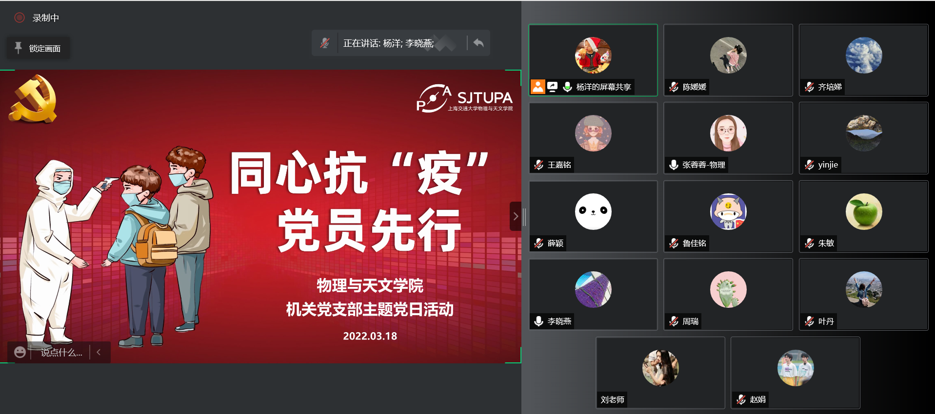 随后,在校外的支部党员逐一分享在抗疫工作的感触或在社区封闭管理期间的感受体会。张蓉蓉表示,抗疫期间需时刻全面关注所有教职工情况,做好信息传达,协调物资采购,完成数据统计,工作琐碎繁杂;陈媛媛表示,摸清人员底数为疫情防控提供第一手数据,公司行政人员积极配合、联络教工,虽身在校外,也时刻待命;叶丹介绍,疫情期间积极联络员工、传达校内防疫情况,为校内防疫工作组织捐赠、提供保障,宣传队伍及时整理师生抗疫素材,做好公司形象宣传。赵娟、王嘉铭作为校外志愿者,多次采购并自驾运送物资,支援公司在校师生;李晓燕时刻与校内教师、物业联系,落实疫情期间实验室安全管理要求,排除安全隐患;薛颖、齐培娣等党员也均作发言,分享感受。