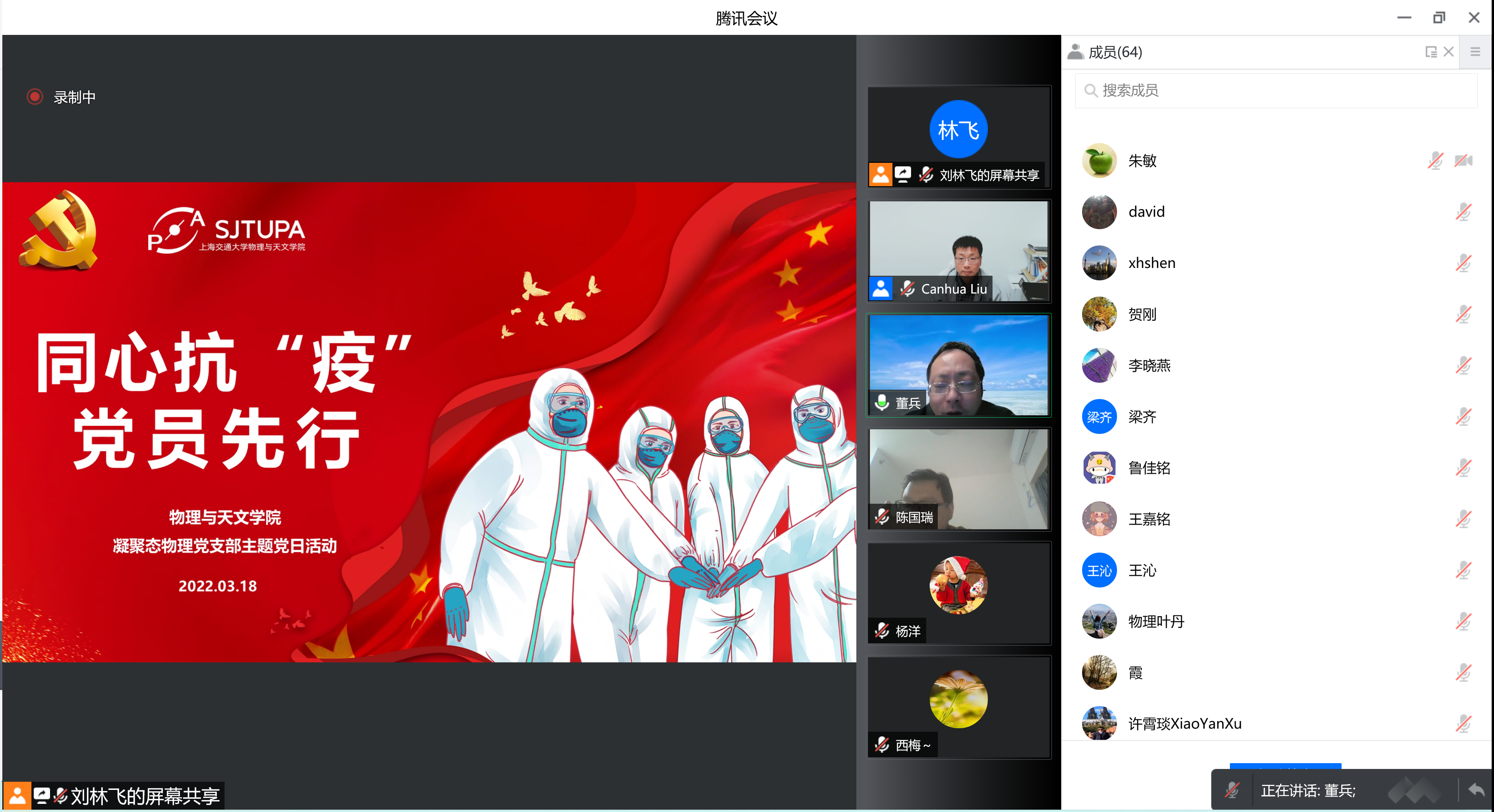 刘灿华首先分享了校内封控期间的志愿工作经历。他于3月12日响应公司号召,作为首批志愿者参与核酸检测区组织引导,并协助公司送餐服务。他谈到,校内志愿服务的组织已逐步体系化、科学化,校内各层工作人员心往一处想、劲往一处使,信息沟通顺畅,各类抗疫问题都能快速有效解决,体现出了交大人的凝聚力、向心力和执行力。刘灿华表达了对抗疫工作早日圆满完成的愿景,并嘱托党员同志继续做好自我管理,认真服务群体,切实起到表率作用。
