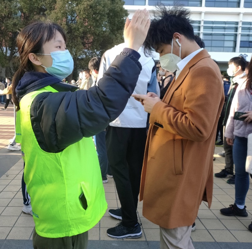 工作期间会遇到各种问题,我遇到一个台湾的阿姨,线上无法预约因此没有二维码,需要人工协调处理,我因为没有这方面业务培训经验,就把她带到我们专门处理港澳台同胞的人工通道处迅速解决了问题。作为一名党员,能在这个特殊时刻,站在一线为交大而战,我感到非常荣幸!