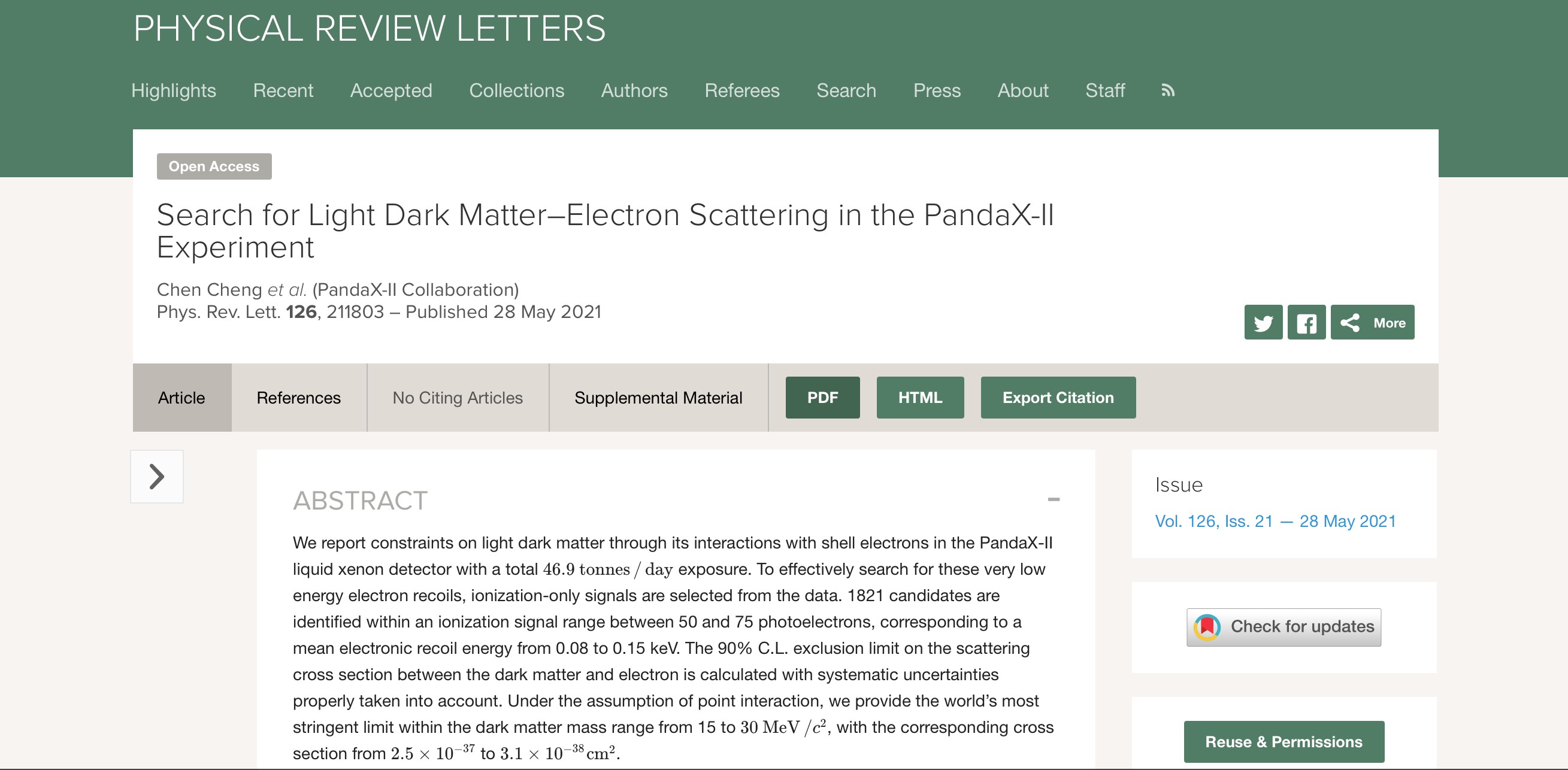 A new result on searching of light dark matter (DM) with PandaX-II experimental data was published online in Physical Review Letters on May 28, 2021 with a title Search for Light Dark Matter–Electron Scattering in the PandaX-II Experiment. This is the 6th PRL paper published with PandaX-II data.