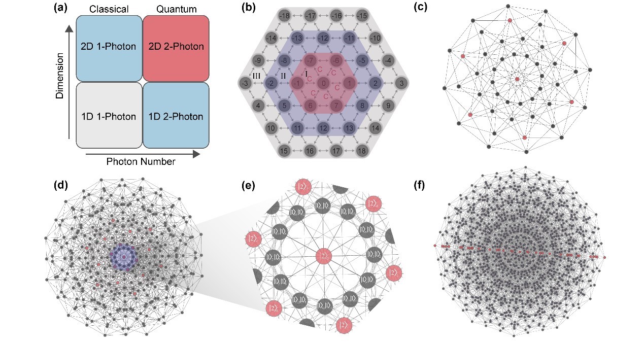 The overall development trend of the quantum walks is shown in Figure.2(a). One way is to increase the number of particles. British scientists used a photonic chip to publish a paper in Science in 2010 (Science 329, 1500, 2010) for the first time to realize the quantum walks of two correlated photons in a one-dimensional lattice. The other way is to increase the spatial dimension of photon evolution. Quantum walks can be mapped to a specific graph (Graph). Based on this graph, it can help us to solve the problems encountered in practice, such as the search problem. However, in reality, the photon walking graph is not complex enough, and the dimension is not high enough, so there is no suitable platform for demonstrating the algorithm. Figure.2(b)-(f) gradually shows the complexity evolution of the graph constructed in the experiment.