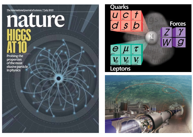 Figure 1: Nature journal cover page – 10th anniversary of the Higgs boson discovery (left); the Standard Model of particle physics (upper right); the Large Hadron Collider at CERN, which lies in a tunnel with 27km circumference beneath the France-Switzerland border near Geneva (bottom right). It is the world’s largest hadron collider with unprecedented center-of-mass energy of 13~14 TeV.