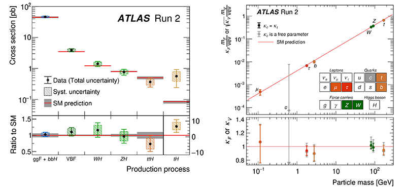 Figure 2: The Higgs production cross sections (left) and the coupling parameters as a function of the particle mass (right). The measurements are in agreement with the SM predictions [1].