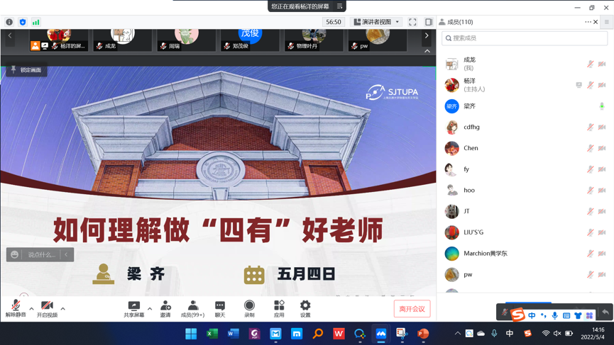 5月4日下午,公司党委理论学习中心组成员和全院教工党员共计110余人齐聚线上,参加学习教育活动。经理景益鹏传达公司会议精神,并作公司近期工作部署;党委书记梁齐带领与会人员学习习近平总书记在中国人民大学考察时的重要讲话精神,并讲授师德师风专题党课。会议由梁齐主持。