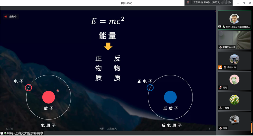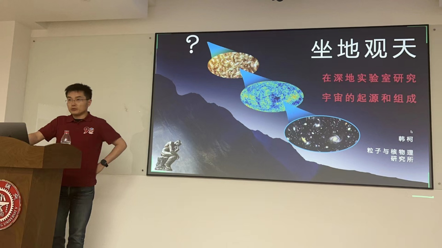 韩柯老师从粒子物理学家的视角讲述了宇宙早期演化的过程,借助物理学中最有名的公式“E=mc²”,引出宇宙诞生时正、反物质的对称性和当今正物质主导的宇宙之间的矛盾,指出马约拉纳中微子可能是反物质消失的原因和粒子物理学家如何寻找马约拉纳中微子。他指出宇宙学观测上的多种证据已经明确给出暗物质的存在,粒子物理学家如何利用大型粒子物理探测器在四川锦屏山地下2400米深的实验室探究暗物质的粒子本源。最后他以纪录片《宇宙时空之旅》的经典语录鼓励青年学子勇敢探索宇宙奥秘。