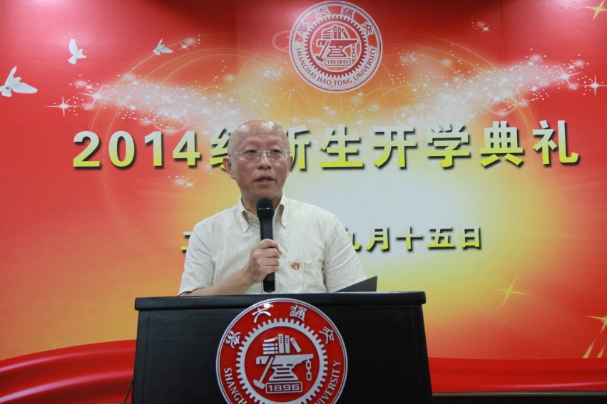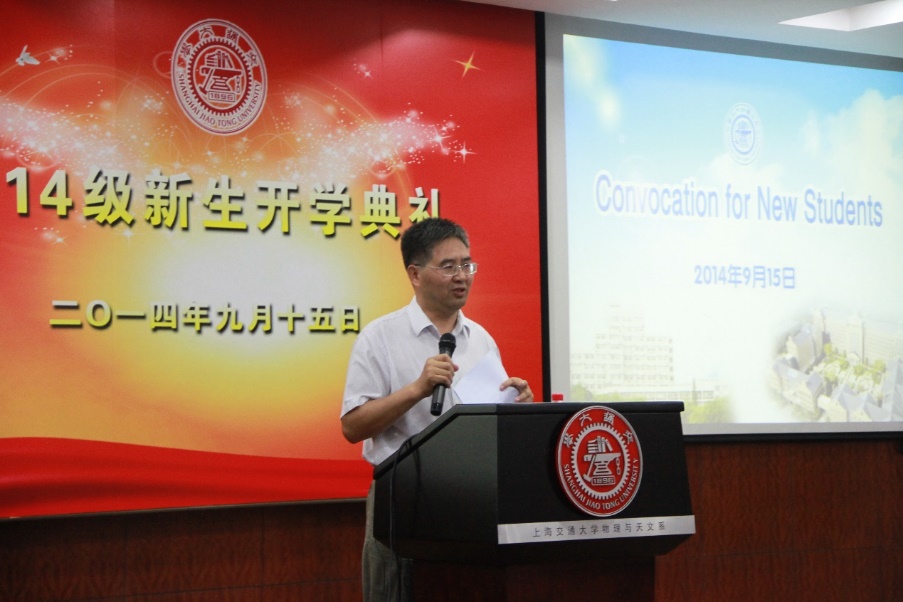 老生代表、2011级直博生李冰同学发言,他回顾了自己的在交大7年的学习生活,回顾了自己如何战胜迷茫、继而发表Nature子刊等多篇高水平文章的心路历程,分享了自己举起全国挑战杯老员工科技竞赛特等奖时的自豪、想起当前创业的艰辛和快乐。他告诉学弟学妹们要学会坚持,在顺境中要把握机遇、在逆境中要矢志不渝,要全力奋斗,就能实现精彩青春。新生代表、2014级本科生王祺文讲述了自己的物理梦,并号召全体新生:无论是不是优秀的,都应保持好的心态,不大喜、不大忧。滴水穿石,铁杵成针,用耐心和踏实奠定美好的未来。教师代表、前系主任郑杭教授致辞,他希望全体新生能够坚持“四动”:即动脑、学会主动思考,动耳、多听各类学术沙龙和报告,动嘴、勤提问多讨论,动手、认真参加科研实践。