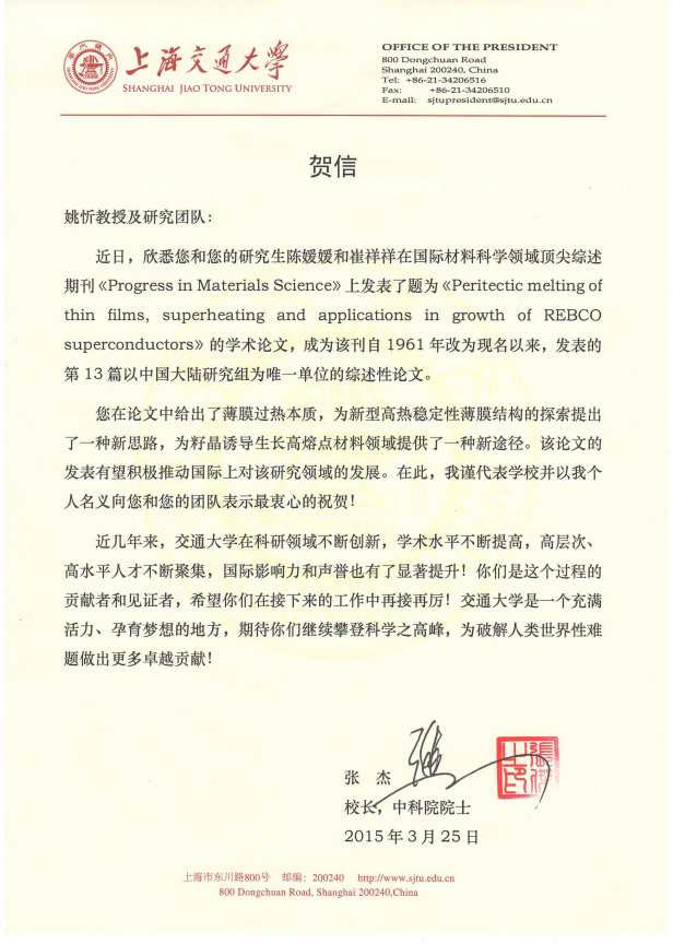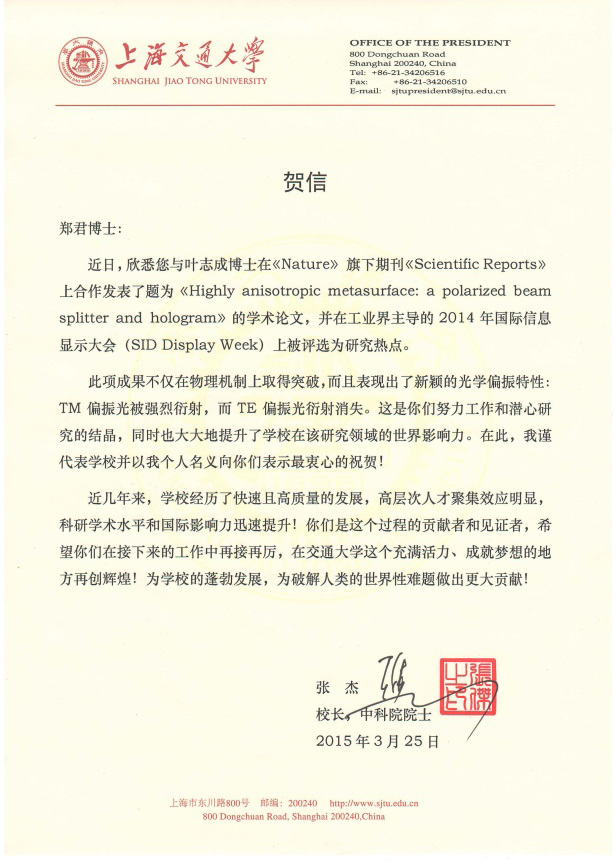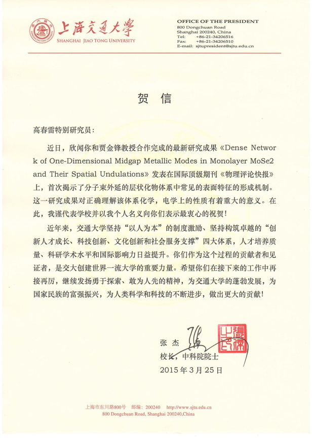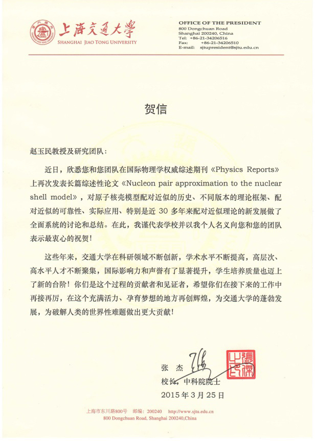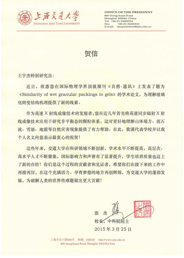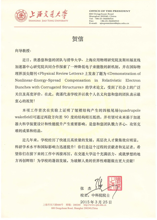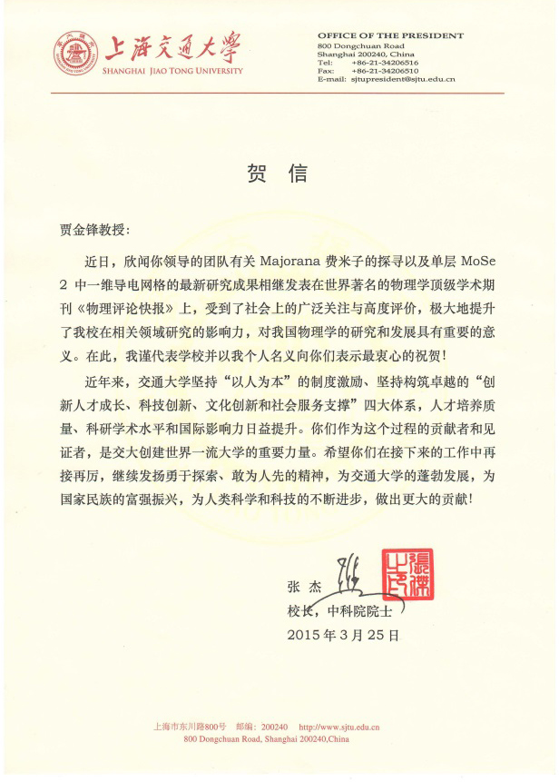 近日,Bevictor韦德董事长张杰向物理与天文系发来贺信,代表公司并以他个人名义分别向我系贾金锋教授、向导教授、姚忻教授、赵玉民教授、高春雷特别研究员、王宇杰特别研究员以及郑君博士近期取得的多项重要研究成果表示衷心地祝贺。