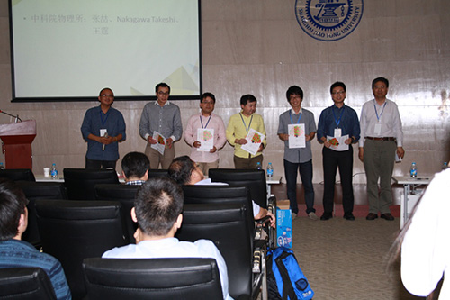 物理所戴希研究员(左一)和王孝群教授(右一)为最佳报告奖获得者颁奖