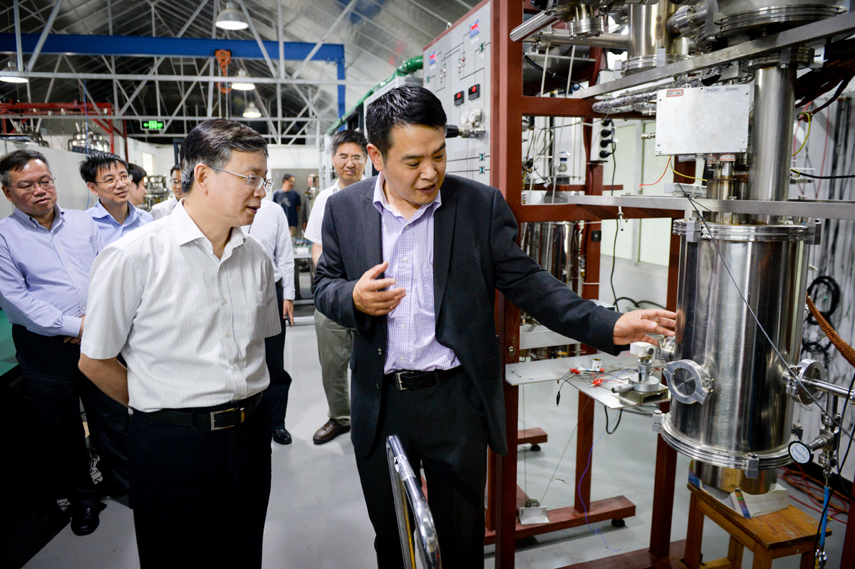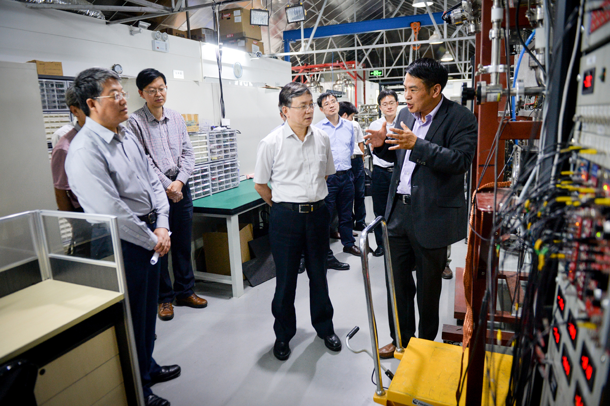 在暗物质实验室,侯建国一行了解了目前PandaX实验500公斤级探测器的运行情况和正在进行预研的高压氙气探测器和单相液氙探测器的研究进展, 详细询问了探测的信号类型、氙探测器如何对暗物质作出响应等暗物质直接探测实验方面的细节。上海交大粒子物理与核物理研究所所长季向东教授介绍了 PandaX暗物质探测实验的进展、现状和今后几年内的研究计划。