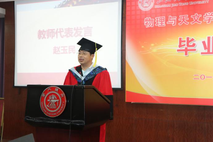 随后,教师代表赵玉民发言,他表示大学毕业是一个新的起点,并结合亲身经历向毕业生们提出了三点祝愿:拥有强健的体魄、清醒的大脑以及宽广的心胸。