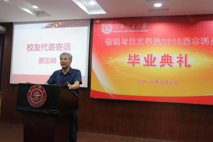 随后, 1983届员工、上海矽睿科技有限公司创始人、IC咖啡创业公司经理谢志峰作为员工代表发言。他回忆起83年毕业时仅仅就在老图书馆合影,感慨今天的毕业生十分幸运。他对毕业生们提出了两点寄语:一是要拥有做决策的能力,并学会对自己的决策负责;二是要有物理人的责任心,潜下心来做基础研究,发挥基础扎实的长处,提高创新意识,投身祖国需要的行业。