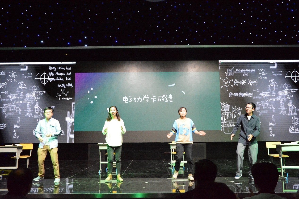 阳光剧社带来的舞台剧《狂热》展示了物院学子的琐碎生活,展现了员工在面对学习考试时从慌乱到胸有成竹的千姿百态。其中由陈翔及吴子昊同学改编的一曲《卡路理》中朗朗上口的“学物理学物理”展现了我们物院学子对于学习天文和物理的一篇赤诚之心。