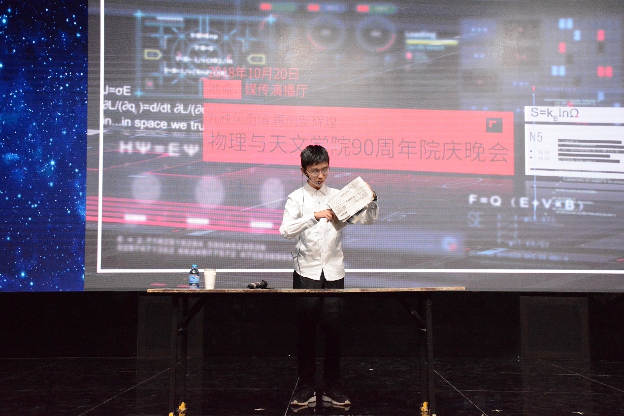 由崔浩天与陶皓杰同学带来的《上知天文 下知地理》相声节目引发了阵阵欢笑,“麦克斯韦的韦没有单人旁”唤醒了在座师生对于量子力学的记忆,展现了物院学子在科研时严谨认真的姿态以及幽默风趣的形象。