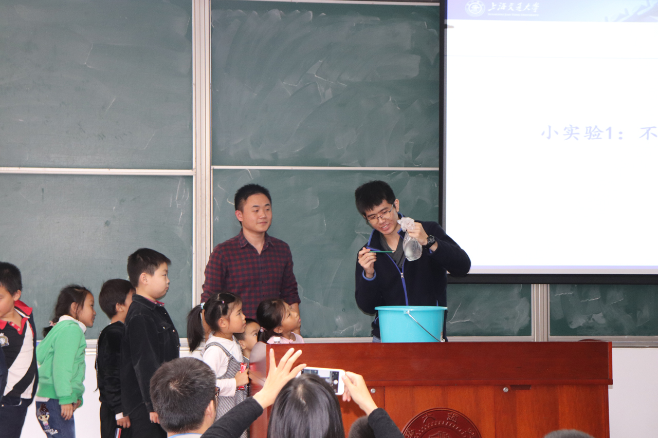 活动伊始,演示厅志愿者李阳给“交二代”安排了一节电磁课。在课上,他从生活常识出发,介绍了电磁学的基本知识,重点阐述了电和磁的关系,并通过趣味知识提问的形式提高小朋友们对物理的兴趣。课堂最后,李阳带领小朋友们一起重温麦克斯韦生平,领略大师风采。接着志愿者赵灌中带领小朋友们体验两个物理小实验:不漏水的袋子和气球中的硬币,小朋友们一一上台进行动手体验。