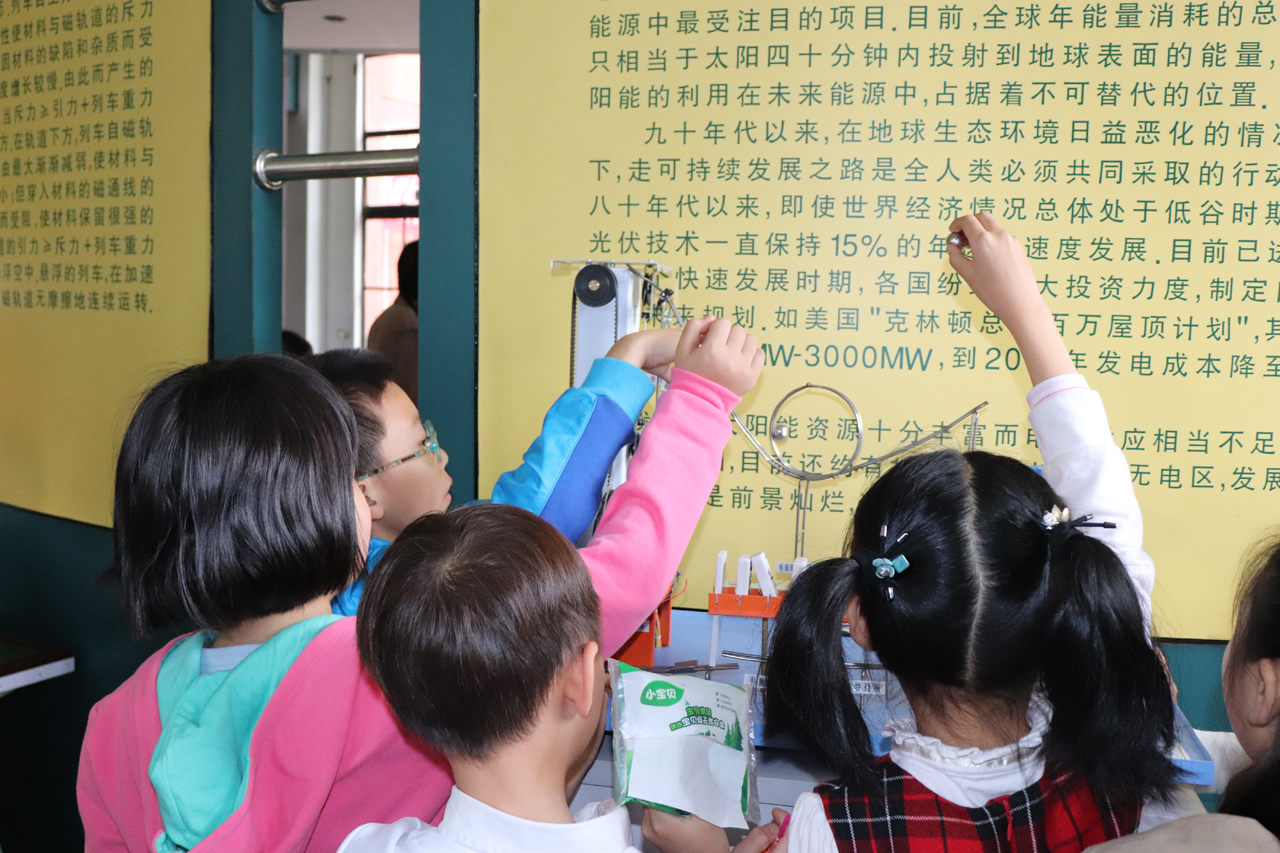 接着,是参观演示厅环节。小朋友们通过观察和体验,了解各式各样的物理现象。坐在旋转的茹科夫斯基凳上感受角动量守恒带来的神奇效果,近距离感受“龙卷风”的磅礴气势,站在“怒发冲冠”上让静电给自己做个“爆炸头”。交二代们在快乐实验的同时,学到了很多物理知识。