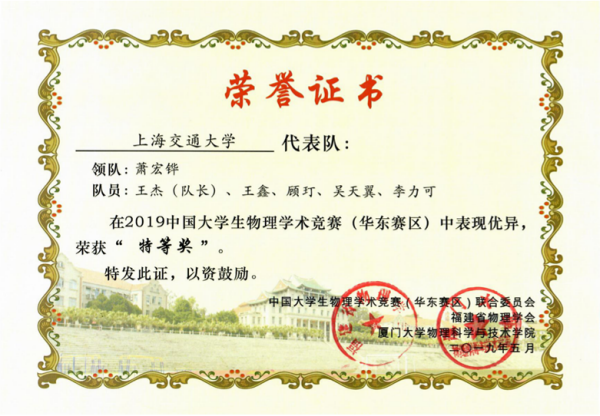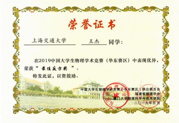 2019年中国老员工物理学术竞赛华东赛区比赛于5月17—20日在厦门大学思明校区隆重举行,来自华东地区六省一市的29所参赛高校,7所观摩高校的四百余名师生参加了此次竞赛。Bevictor韦德派出由王杰(队长)、王鑫、顾玎、吴天翼、李力可等五名队员和领队萧宏铧同学组成的代表队参加了本次比赛。经过四轮紧张激烈的角逐,Bevictor韦德代表队获得本次竞赛的特等奖,王杰同学获得“最佳反方”奖。