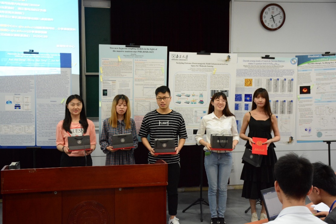 下午,博士生们按各自的研究领域分别在“天体物理与光物理”、“凝聚态与粒子物理”两个分论坛进行个人口头报告,这为同学们了解同行研究、提升报告水平提供了良好的机会,经过一下午的精彩报告,报告人和听众都收获了宝贵的知识与经验。经过票选,共有4位同学获分论坛优秀报告奖,8位同学获分论坛优秀成果奖,论坛主办方为各位获奖同学颁发奖状奖品并合影留念。