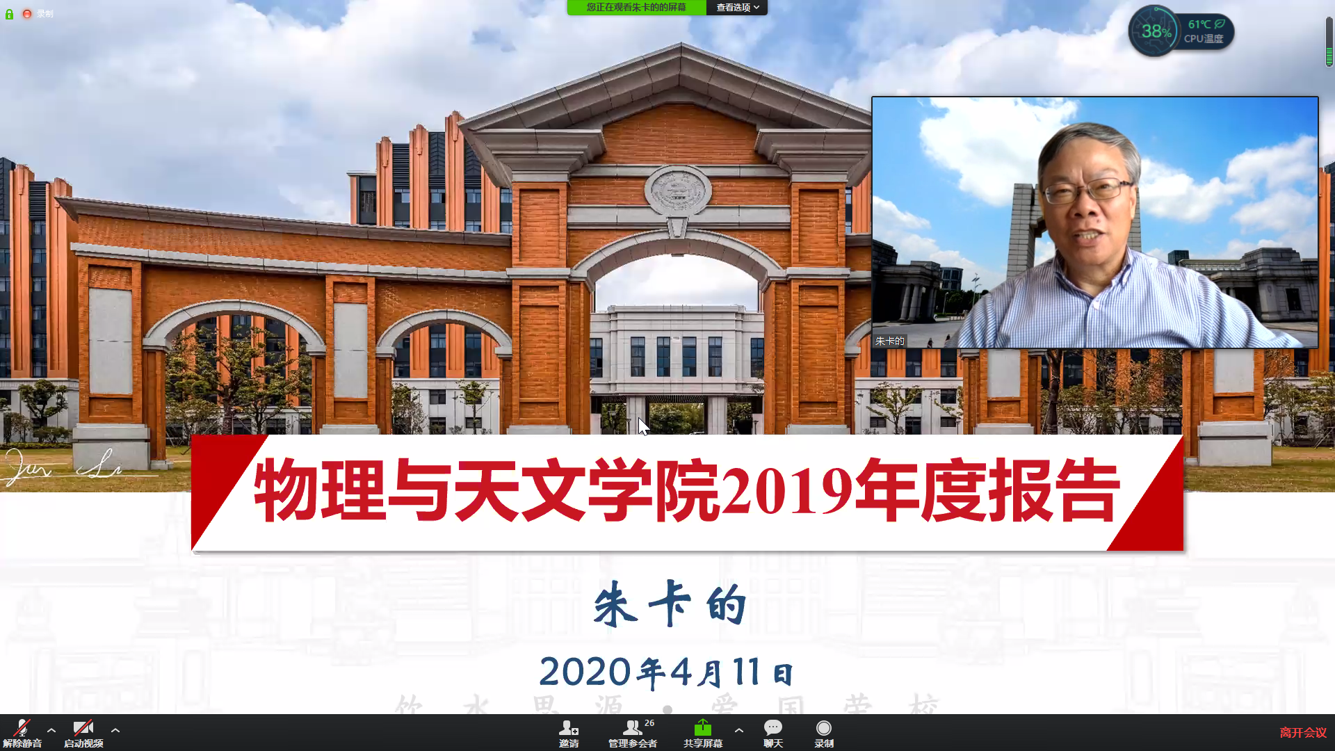 党委书记朱卡的介绍2019年度公司发展情况。朱书记表示,在全球抗击新冠疫情的特殊时刻,虽然大家相隔千里,但祝愿母校的心意是相通的。随后,他从年度重要突破、年度重点工作以及员工工作三个方面,向员工们详细介绍了公司在团队建设、教书育人、团队队伍、科研创新、国际声誉等方面的发展,表示公司的发展离不开广大员工的支持,呼吁在疫情结束后,员工们能常回家看看。