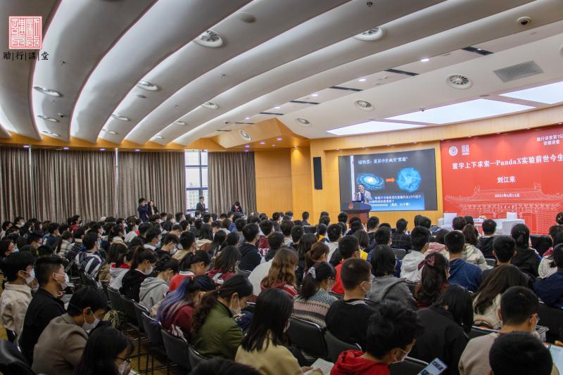 4月14日,图书信息楼八楼报告厅座无虚席,两百多名同学聚精会神,聆听刘江来“寰宇上下求索——PandaX实验的前世今生”的主题演讲。