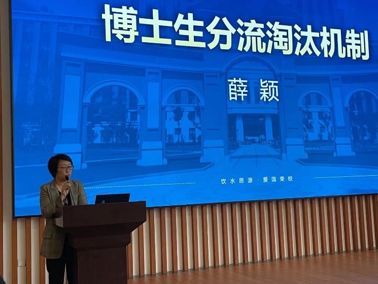 教务办公室主任薛颖就博士生分流淘汰机制做了详尽介绍。她表示,员工状态会在培养过程中出现多种状况,导师应及时关注员工的学业情况,对力不从心的员工要因势利导并及时与教务办沟通,适时调整员工的培养方案。