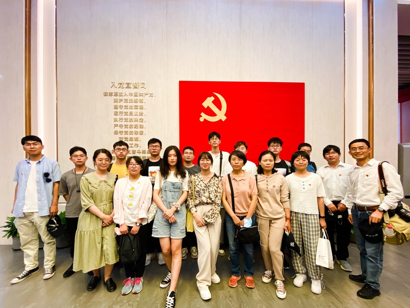 光纤国重的师生在一大会址纪念馆内宣誓墙前合影