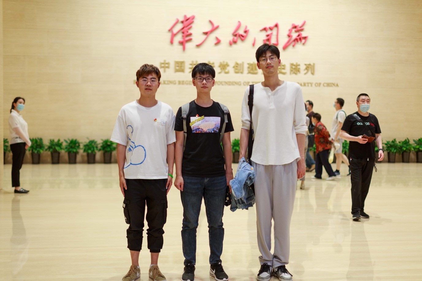 光纤国重的研究生吴琪、丁梦军和陈亮在一大会议纪念馆合影