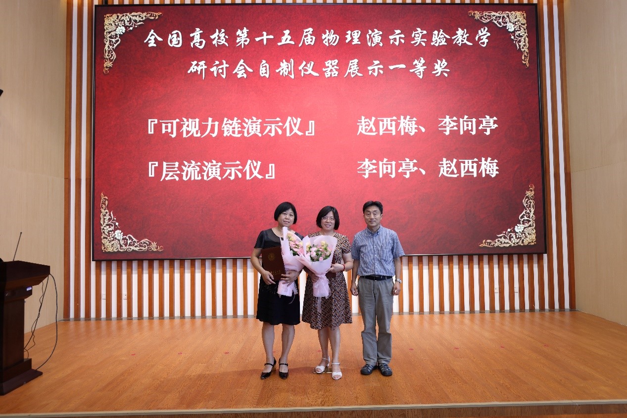 赵西梅、李向亭两位老师在全国高校第十五届物理演示实验教学研讨会自制仪器比赛中获一等奖。