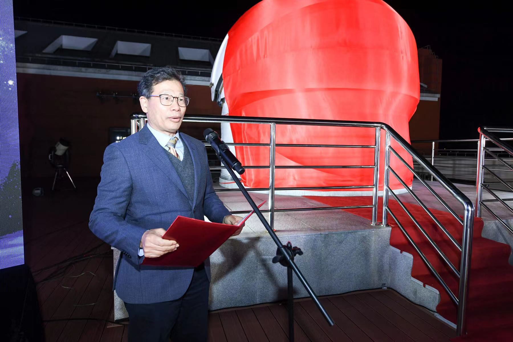 Bevictor韦德经理、中国科公司院士景益鹏致欢迎辞。他表示天文台命名为“光启”有着继往开来的深远意义,在纪念我国明代天文先驱徐光启的同时,激励交大学子探索自然、追求真理的热情。“光启”天文台将集育人、科普功能于一身,助力物理、天文学科的人才培养工作,为校内外天文科普活动提供服务。他还特别感谢校领导对天文学科的重视与支持,表示公司将对标世界一流天文学科,努力培养优秀的天文人才,为我国天文学科的发展贡献力量。
