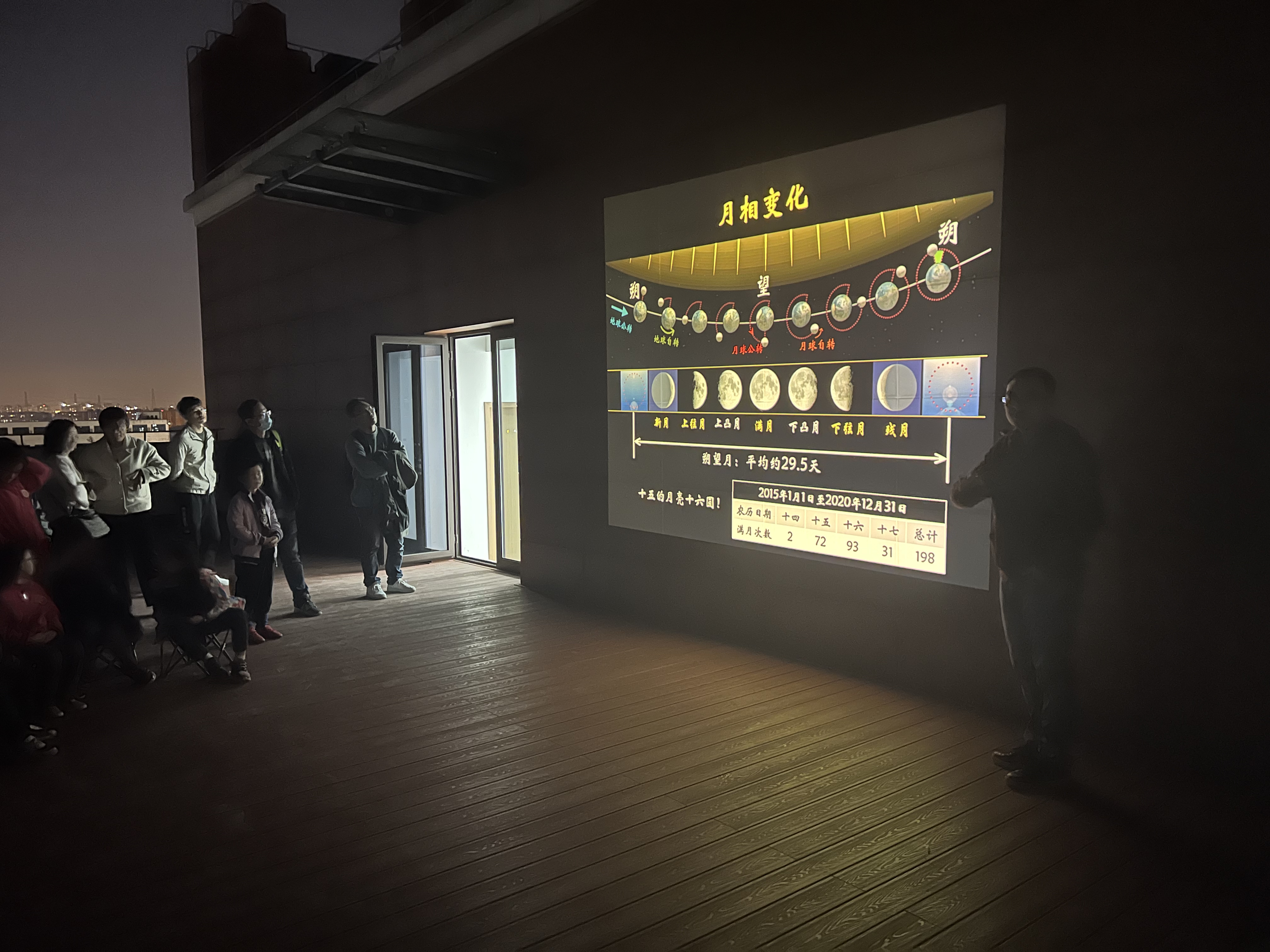随后在18:30,天文系刘成则老师为大家带来一场名为《月亮那些事儿》的精彩科普报告。刘老师引经据典、博古论今,从诗词、传说开始,为公众讲述了人类对太空的遐想和探索,并通过对月相的详细介绍,全方位为大家揭开了月亮的神秘面纱。随后,志愿者为现场观众播放了宇宙揭秘的科普纪录片。