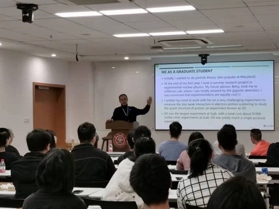 之后是刘江来老师的介绍。刘老师长期从事暗物质和中微子实验,是李所粒子部和交大粒子所的特聘教授。他回顾了自己研究生期间的经历和所遇到的困难,直言他员工时期从两位导师处获益良多。员工期间,他学会了做一个“简单”的人:只专注于科研和解决问题;总是乐于承担任务,而不介意是否琐碎(dirty work);学会开放性思维和批判性思考,如有意见分歧,不做哲学上的争辩,只用数据和实验推理;同时,尽最大努力进行精彩的演讲,因为这也是总结工作的绝佳机会。论及在合作组的工作,刘老师认为职业发展主要取决于个人的声誉,大型合作组的优势在能够吸收他人优秀的方面、学习如何和他人合作与沟通、以及工作容易被同行知晓。他鼓励大家专注于研究工作,不必担心功劳(credit),对功劳的过度焦虑只会带来不安全感和痛苦。