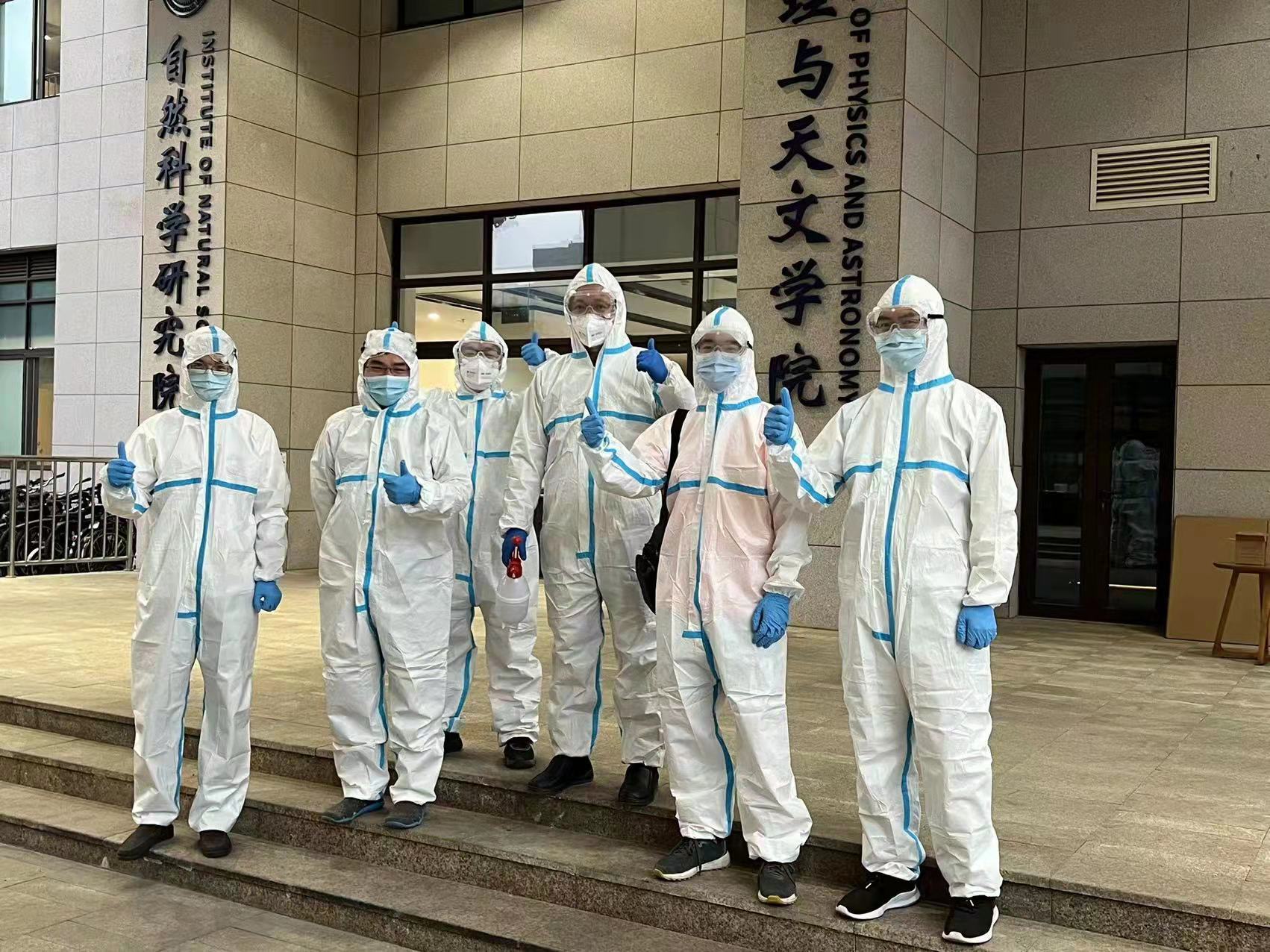 穿上防护服,开启物理天文公司大白“盲盒”。宿舍消杀、配餐送饭、核酸检测,少不了穿着防护服的大白们的身影。大白的皮囊里面承载着物天人的内核,熟悉的老师们,化身为穿行在校园中的守护者。