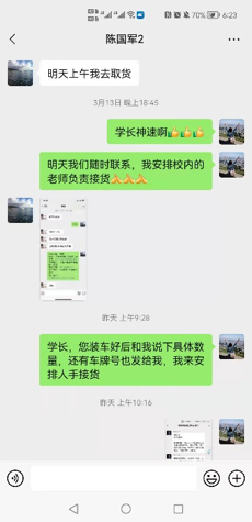 为了能尽快将物资送达到校内老师手上,陈国军员工将公司储备的用于员工防疫的物资储备贡献出来送给母校。