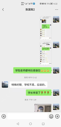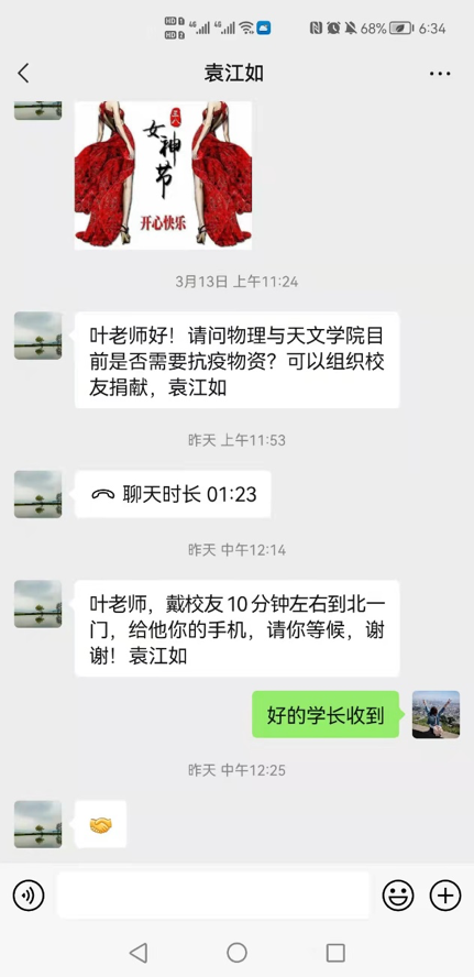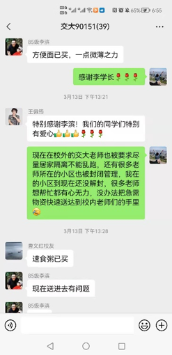 李滨、曹文红员工在捐赠物资的同时积极发动班级同学共同抗疫,在班级群里内不断转发母校的最新情况。