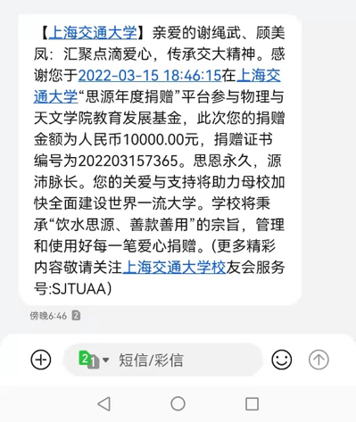 谢绳武老董事长在了解到疫情的严峻形势后,积极联系公司了解当前情况,关心校内老师和同学们的健康情况和生活学习,并以其与夫人顾美凤老师的名义向公司捐赠一万元用于支持抗击新冠疫情。