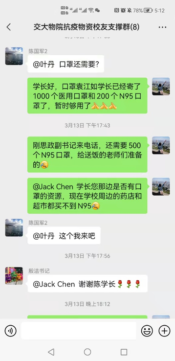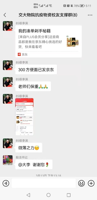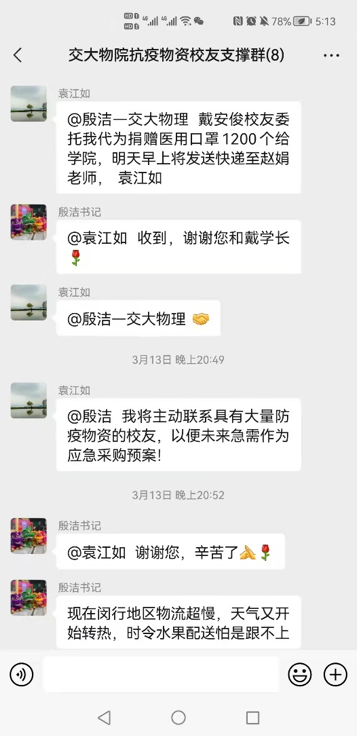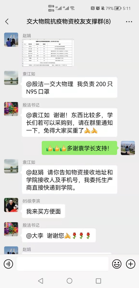 在得知公司防疫物资紧缺后,79级员工袁江如,85级员工李滨、曹文红,92级员工陈国军,94级员工王楠,05级员工宣秋等众多热心员工第一时间联系母校,建立交大物院抗疫物资员工支撑群,对抗疫一线的师生表达了真切的问候,在详细了解了公司当前的困难后,主动表示捐赠抗疫物资帮助公司共度难关。几位学长学姐商议之后迅速分包了公司的紧缺物资,接着马不停蹄开始网上下单、联系厂商、发动同学、寻找资源。