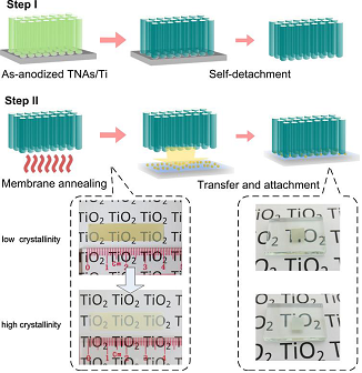 图:上方是二氧化钛纳米管薄膜剥落和转移过程示意图。下方左列是剥落下来的大面积的薄膜和高温结晶的薄膜。右列显示的是把薄膜粘附于FTO基底上形成的光阳极的照片。