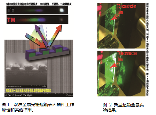郑君和叶志成等研究人员巧妙地结合了非共振的纳米金属狭缝波导和光栅衍射的内禀特性,提出一种独特的一维超颖表面结构。如图1所示,他们制备出金属厚度几十纳米、狭缝宽度百纳米的双层金属光栅超颖表面器件,使TE(横电场)和TM(横磁场)偏振光表现出截然不同的反射和衍射特性,实现了宽角度、宽波段、高效率的反射式偏振分束。更进一步,他们将这种超颖性质和全息的条纹结构相结合,提出了一种只有TM偏振光才能够再现图像的、更为安全的超颖全息防伪方案,实验结果见图2。此外,这种新型的超颖表面有望在新型显示器、激光器、集成光学、以及太赫兹光学和非线性光学上得到广泛应用。