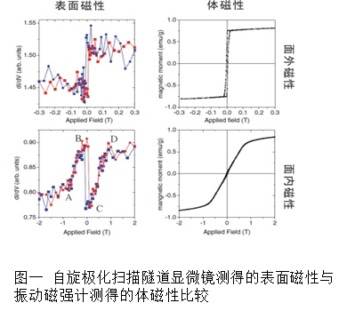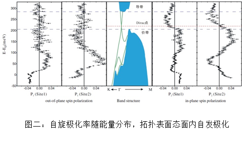 对于Cr掺杂的Sb2Te3体材料,虽然已有实验证实其体态的磁性表现为理想的c轴易轴铁磁性,即易轴完全垂直于层状解离面,而面内方向几乎没有探测到磁滞现象,但针对该材料表面的磁性尚未被研究过,因为表面磁性的测量长期以来是一个难题。贾金锋研究组采用的是可以探测自旋非平衡分布的自旋分辨扫描隧道显微镜技术。实验表面,面外测量中具有矫顽力为50Gs的易轴特性,这与体材料测量完全一致。而面内测量则不但观测到体测量时的1T处的饱和现象,并且还发现了500Gs矫顽力的一个新的磁滞信号。通过在隧道能谱中看自旋分辨,他们对不同能量的面内磁滞回线进行分析,得到了两组不同的自旋极化率,一组代表面外易轴磁矩在面内的饱和行为,另一部分是面内500Gs矫顽力的磁滞行为。进一步的研究发现在材料的能隙中,体磁性的部分信号为零,而面内磁滞行为的信号在能隙中不为零。在能隙中的电子态密度完全由表面态贡献,说明了面内奇异的磁性与表面态有关。