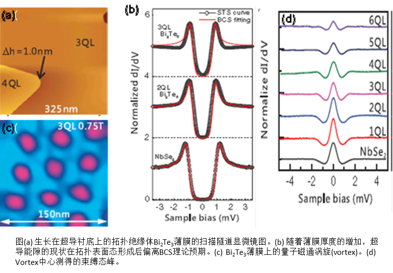 最近,他们又在以上工作的基础上进一步证明这种拓扑绝缘体/超导异质结表面是一种具有特殊性能的人造拓扑超导体。他们以相同的分子束外延法成功地制备出质量更好的拓扑绝缘体/超导体异质结:Bi2Te3/NbSe2。在极低温(400 mK)和强磁场(0-3 T)的环境下,他们利用扫描隧道显微镜/谱对其进行了细致的研究,发现当Bi2Te3厚度达到3层,拓扑表面态形成以后,超导能隙会偏离BCS理论给出的形状,这说明拓扑表面态变成了超导,对超导能隙有所贡献,即该异质结构是拓扑超导。更为重要的是,他们首次在近邻效应诱导的超导体中观测到了量子磁通涡旋,对单个磁通涡旋的研究也表明Bi2Te3薄膜表面的超导是拓扑超导。在磁通涡旋的中心,他们还成功地测量到了束缚态。理论预言:Majorana费米子就隐藏在这些束缚态中,进一步研究将可能揭开Majorana费米子的神秘面纱。这一实验结果表明该实验室在探寻Majorana费米子的道路上又迈出了重要的一大步。