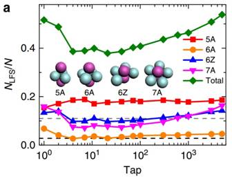 作为软物质体系的一种,颗粒物质是完全非热平衡的。但是有很多理论研究猜想在非平衡体系中,发生非晶相变与热平衡体系玻璃转变有非常类似的结构机制。过去对颗粒体系的研究因受限于实验技术无法穿透一般不透明的颗粒材料而一直发展缓慢。作为高速X射线成像技术的发展者,王宇杰研究组在最近几年首先将高速同步辐射X射线成像技术应用于研究非平衡态的颗粒体系。该组利用高通量的同步辐射可以快速得到颗粒体系的实空间结构及动力学,在非晶相变及非晶固体的塑性形变研究上取得了一定的进展。在这篇论文中,他们对用于模拟具有相互吸引作用的原子体系的湿颗粒堆进行三维CT成像,在其中找到了与胶体体系中相似的具有五轴对称性的局部最优结构,并且发现这些结构在体系变密的过程中有显著的变化(下图是湿颗粒堆中局部最优结构的演变曲线)。这项结果支持了上述的玻璃化转变的几何机制。同时,他们对比了模拟硬球体系的的干颗粒堆,发现其局域结构与有吸引相互作用的体系完全不同。这种区别暗示硬球体系可能有不同的结构短程序。相比之下,两种体系的结构对相关函数变化微小,表明玻璃化转变过程中,更高阶的结构相关函数起着重要的作用,而这些高阶相关函数不能被简单的倒易空间的散射技术得到,而必须求助于实空间成像,从而体现了非晶体系研究中三维实空间成像技术的重要性。