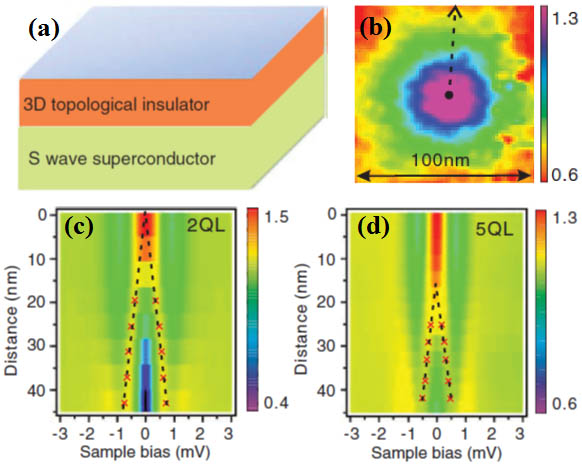 (a) 拓扑绝缘体/超导体异质结模型图;(b)在异质结表面上观测到的量子磁通涡旋;(c,d)在磁通涡旋中观测到的束缚态的空间分布图。前者的Bi2Te3 薄膜厚度小,没有Majorana费米子存在,束缚态为V-shape劈裂;后者的厚度增大后出现了Majorana费米子,所以束缚态呈现Y- shape劈裂。