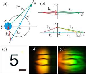 万文杰研究组提出用四波混频的方法实现负折射,如图(a,b)。当泵浦光垂直入射到介质表面上时,产生的四波混频光与入射的探测光之间是负折射的关系。这种关系由相位匹配条件决定。与美特材料只能支持TM模式的波相比,他们的方法对TE和TM波都适用。进一步的,他们把一块普通的载玻片用作平面透镜来对物体成像,结果如图(c, d, e)所示。在非共线的光路下图像有一维是清晰的,另一维会由于色散而模糊,在共线的光路下图像的两个维度都是清晰的。这种方法可以应用到显微镜中并且有望实现突破衍射极限的成像。