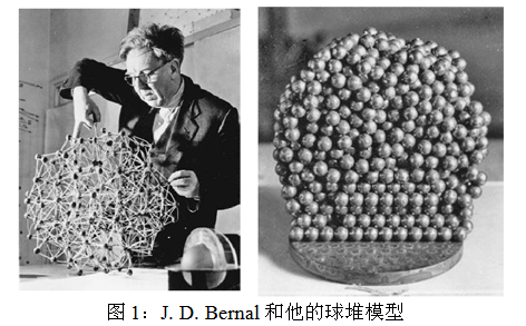 颗粒体系是研究玻璃化转变问题的一个重要的模型体系,在玻璃研究尤其是金属玻璃体系中有很重要的影响。事实上,早在上世纪六十年代,著名的英国科学家J.D. Bernal就率先利用球形颗粒堆积来模拟液体和玻璃结构,并且深刻地洞见了其中的联系(图1)。不同于基于分子原子玻璃体系的实验研究,宏观模型体系具有非常类似的物理过程,但是由于其单元具有宏观大小,可以允许对体系进行微观结构、动力学和热力学的研究。对揭示玻璃转变的物理机制具有非常大的优势。