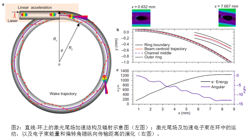 在第二种方案,他们提出了利用弯曲等离子体通道实现尾波加速及类偏转磁铁辐射。通常的尾波加速都是在直线结构中,当等离子体通道弯曲,且曲率满足一定的条件时,激光束及尾波结构可以被通道导引前行,同时完成加速与辐射。利用计算机模拟,他们验证了能量高达600MeV的电子束,可以在半径为3厘米的等离子通道环中加速并辐射出11keV能量的光子。