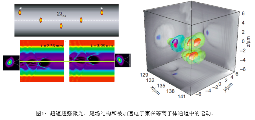 最近激光等离子体实验室陈民特别研究员与盛政明、张杰教授等合作者提出了两种新型的激光尾波加速辐射方案。在第一种方案,他们利用等离子体通道来实现激光束的导引及尾波加速,用以实现类似于波荡器的辐射。当激光束初始以偏轴或以一定的角度入射到具有抛物型密度分布的直等离子体通道中时,由于通道密度引起的横向非均匀折射率会使得超短、超强激光在等离子体通道中发生横向振荡,跟随其后的十微米尺度的尾波结构以及尾波中的被加速电子束会做同样的横向振荡,产生同步辐射。当电子束本身在尾场中的Betatron振荡周期大于该横向振荡周期时,辐射完全由波荡性质决定。该振荡的周期和幅度均可以通过对激光入射角及等离子体通道参数的改变而得到调控。