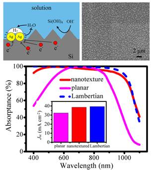 沈文忠教授研究团队首次提出了一种全溶液过程制备纳米金字塔绒面的方法,无需掩膜或离子束刻蚀,简单且成本低。这种方法只需在溶液中使硅表面沉积上一层银纳米颗粒,然后 直接进行碱腐蚀即可形成均匀而致密、平均尺寸约500 nm的金字塔绒面。这主要是得益于银纳米颗粒可优先萃取反应过程中在硅表面产生的电子,从而影响反应产物氢气泡的分布,使整个硅表面可均匀受到各向异性腐 蚀。同时由于不存在掩膜过程,所以自然形成随机分布的纳米金字塔。在光学特性上,这种随机硅纳米金字塔绒面相比周期性金字塔绒面可以激发更多光学共振模 式,故可以更有效实现宽波段陷光。在超薄硅表面通过采用这种硅纳米金字塔绒面,光吸收效果远胜于平面型硅表面,甚至在400-1100 nm的宽波段范围内都具有接近理想光学吸收Lambertian极限,证明了其优越的陷光效果。对太阳电池应用来说,这一光学特性保证了短路电流密度不会 因硅材料的巨大减薄而受损。