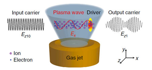 最近,激光等离子体教育部重点实验室/IFSA协同创新中心的於陆勒、盛政明及合作者在等离子体强光调制器研究上取得重要突破,研究团队先用一束具有弱相对论光强的超短飞秒激光脉冲在亚毫米尺度的稀薄气体中激发起一种电子等离子体波(类似于船在水中航行时留下的尾迹)。该等离子体波跟随激光脉冲以接近真空中光速的相速度传播,其特征振荡频率在THz量级。当另外一束有一定时间延迟的、同向传播的皮秒信号脉冲传输到等离子体波区域时,它的振幅和频率能够快速地被等离子体波同时调制,产生具有非常大的频谱带宽脉冲列,其低频部分甚至能延伸至中红外波段。这种等离子体调制器能够承受的激光脉冲强度可比传统的弱光调制器的光强阈值高十几个数量级,调制速度快1-2个数量级。由于实现等离子体调制器所需的激光条件已经可以通过商品化激光器获得,它有望成为一种新型的等离子体光子器件,在强THz辐射产生、超亮X射线产生和激光聚变领域获得应用。