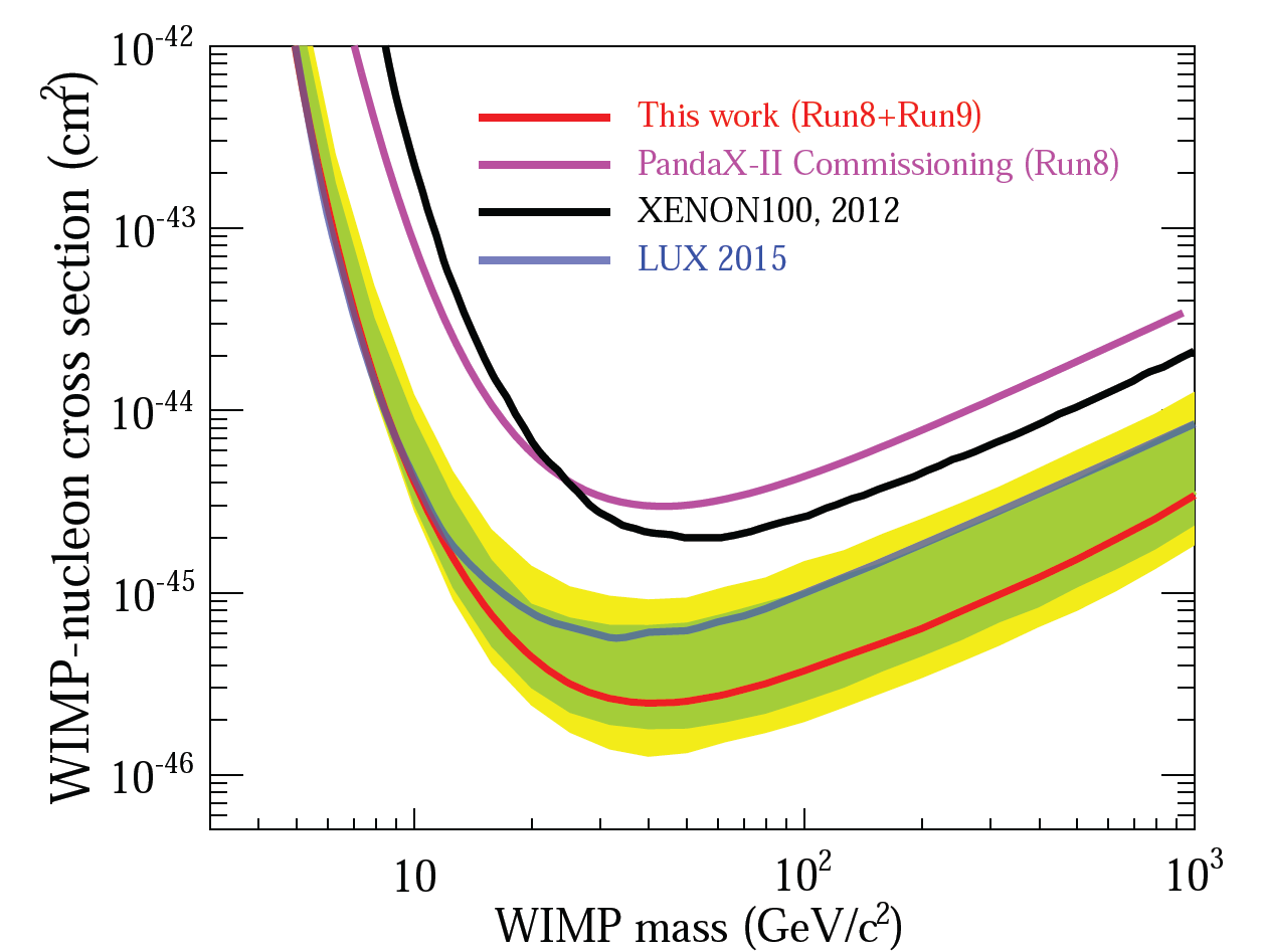 PandaX合作组使用的二相型氙时间投影室技术是目前世界最先进的暗物质探测技术,近十年来,基于该技术的探测实验多次给出了世界上最好的暗物质探测结果,得到了越来越强的对暗物质与原子核发生自旋无关的弹性碰撞截面的上限。到2016年6月底,PandaX-II实验采集了接近80天的低本底暗物质探测数据,记录了超过2400万的事件。 通过对这些数据进行分析和甄别,发现只有一个可疑的事例符合暗物质与原子核碰撞的特征,但实际上,它也与来自探测器自身材料的放射性导致的本底相符合,因而被排除。结合了2015年末实验19天试运行的数据,PandaX实验给出了对暗物质和普通物质散射截面的最强限制。虽然PandaX目前的探测灵敏度已进入到理论家预言的可以探测到暗物质的能区和灵敏度范围内,但离最终排除暗物质粒子为“弱相互作用重粒子”还差三个数量级。 500公斤级的PandaX-II探测器是目前世界上运行中最大的暗物质探测器,目前PandaX-II探测器正在继续运行中。