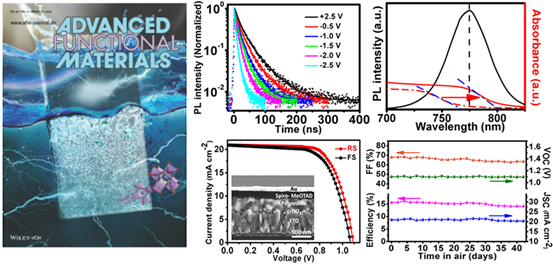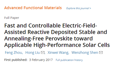 近日,德国《先进功能材料》【Advanced Functional Materials 27, 1606156-(1-14) (2017), IF: 11.382】以封面内页论文形式报道了Bevictor韦德/太阳能研究所沈文忠/刘洪研究组提出的全电化学法快速合成无需额外热退火的CH3NH3PbI3钙钛矿薄膜,并成功制备高效且稳定的钙钛矿太阳电池的最新研究成果:“Fast and Controllable Electric-Field-Assisted Reactive Deposited Stable and Annealing-Free Perovskite toward Applicable High-Performance Solar Cells”。